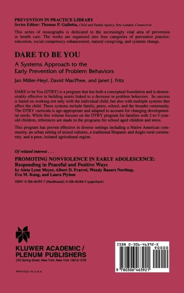 DARE To Be You (DTBY) is a program that has both a conceptual foundation and is demonstrably effective in building assets linked to a decrease in problem behaviors. Its success is based on working not only with the individual child, but also with multiple systems that affect the child. These systems include family, peers, school and the broader community. The DTBY curricula is age-appropriate and adapted to account for changing developmental needs. While this volume focuses on the DTBY program for families with 2 to 5 year old children, references are made to the programs for school aged children and teens.