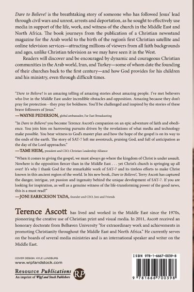Dare to Believe! is the breathtaking story of someone who has followed Jesus' lead through civil wars and unrest, arrests and deportation, as he sought to effectively use media in support of the life, work, and witness of the church in the Middle East and North Africa. The book journeys from the publication of a Christian newsstand magazine for the Arab world to the birth of the region's first Christian satellite and online television services--attracting millions of viewers from all faith backgrounds and ages, unlike Christian television as we may have seen it in the West. Readers will discover and be encouraged by dynamic and courageous Christian communities in the Arab world, Iran, and Turkey--some of whom date the founding of their churches back to the first century--and how God provides for his children and his ministry, even through difficult times.