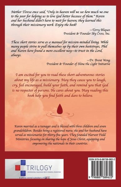 Mother Teresa once said, "Only in heaven will we see how much we owe to the poor for helping us to love God better because of them." Karen and her husband didn't have to wait for heaven; they learned this through their missionary work. Enjoy the book! -Terry Bliquez, President & Founder Sky Cross, Inc. These short stories serve as a manual for mission-minded living. While many people strive to pull themselves up by their own bootstraps, Phil and Karen have found a more excellent way-to trust in the Lord, always. -Dr. Brent Wong, President & Founder of Shine the Light Initiative ¿¿I am excited for you to read these short adventurous stories about my life as a missionary. May they cause you to laugh, cry, feel encouraged, build your faith, and remind you that God is no respecter of persons. He cares about you. May reading this fibook help you find faith and dare to believe. Karen