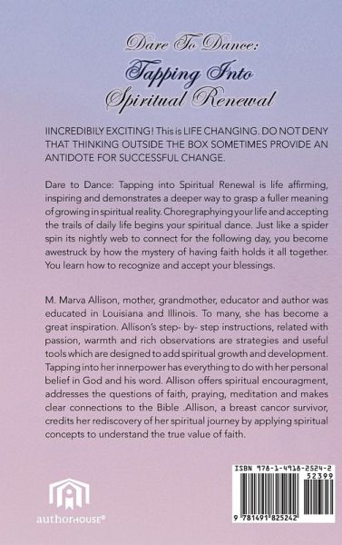 IINCREDIBILY EXCITING! This is LIFE CHANGING. DO NOT DENY THAT THINKING OUTSIDE THE BOX SOMETIMES PROVIDE AN ANTIDOTE FOR SUCCESSFUL CHANGE. Dare to Dance: Tapping into Spiritual Renewal is life affirming, inspiring and demonstrates a deeper way to grasp a fuller meaning of growing in spiritual reality. Choregraphying your life and accepting the trails of daily life begins your spiritual dance. Just like a spider spin its nightly web to connect for the following day, you become awestruck by how the mystery of having faith holds it all together. You learn how to recognize and accept your blessings.