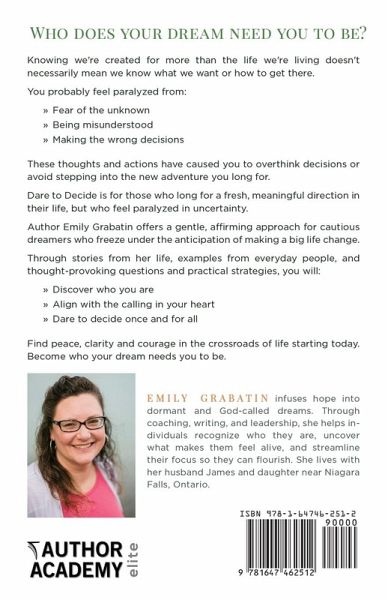 Who does your dream need you to be? Knowing we're created for more than the life we're living doesn't necessarily mean we know what we want or how to get there. You probably feel paralyzed from:Fear of the unknown Being misunderstood Making the wrong decisions These thoughts and actions have caused you to overthink decisions or avoid stepping into the new adventure you long for. Dare to Decide is for those who long for a fresh, meaningful direction in their life, but who feel paralyzed in uncertainty. Author Emily Grabatin offers a gentle, affirming approach for cautious dreamers who freeze under the anticipation of making a big life change. Through stories from her life, examples from everyday people, and thought-provoking questions and practical strategies, you will:Discover who you are Align with the calling in your heart Dare to decide once and for all Find peace, clarity and courage in the crossroads of life starting today. Become who your dream needs you to be.