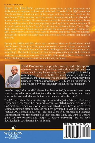 Dare to Declare combines the instructions of daily devotionals and declarations to empower a closer walk with God. Proverbs 21:18 (KJV) states that "Death and life are in the power of the tongue and they that love it shall eat the fruit thereof." What we utter out of our mouth determines whether we abound or become bound. At times, life can become extremely overwhelming and so heavy that it weighs us down. Our emancipation is produced by our communication. If we don't possess the faith to "say it", we will lack the enduring faith to "see it". The Bible instructs us to "shout unto to God with…mehr