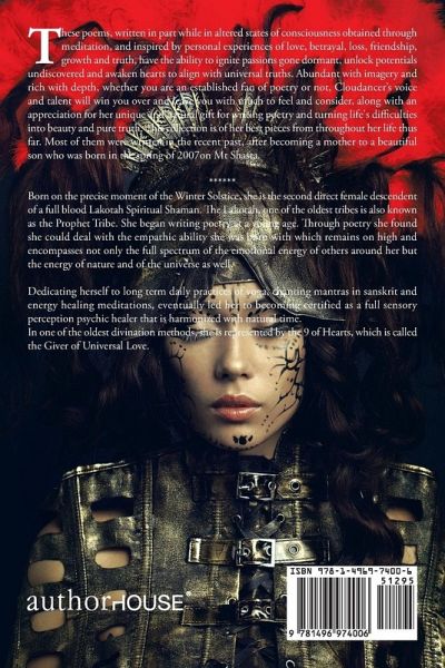 These poems, written in part while in altered states of consciousness obtained through meditation, and inspired by personal experiences of love, betrayal, loss, friendship, growth and truth, have the ability to ignite passions gone dormant, unlock potentials undiscovered and awaken hearts to align with universal truths. Abundant with imagery and rich with depth, whether you are an established fan of poetry or not, Cloudancer's voice and talent will win you over and leave you with much to feel and consider, along with an appreciation for her unique and natural gift for writing poetry and turning life's difficulties into beauty and pure truth. This collection is of her best pieces from throughout her life thus far. Most of them were written in the recent past, after becoming a mother to a beautiful son who was born in the spring of 2007on Mt Shasta.