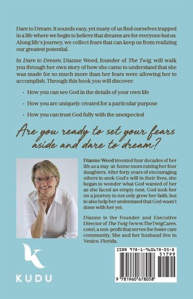 Dare to Dream. It sounds easy, yet many of us find ourselves trapped in a life where we begin to believe that dreams are for everyone but us. Along life's journey, we collect fears that can keep us from realizing our greatest potential. In Dare to Dream, Dianne Weed, founder of The Twig, will walk you through her own story of how she came to understand that she was made for so much more than her fears were allowing her to accomplish. Through this book you will discover:How you can see God in the details of your own life How you are uniquely created for a particular purpose How you can trust God fully with the unexpected Are you ready to set your fears aside and dare to dream?