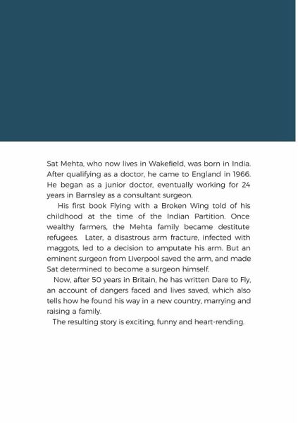 Sat Mehta, who now lives in Wakefield, was born in India. After qualifying as a doctor, he came to England in 1966. He began as a junior doctor, eventually working for 24 years in Barnsley as a consultant surgeon. His first book Flying with a Broken Wing told of his childhood at the time of the Indian Partition. Once wealthy farmers, the Mehta family became destitute refugees. Later, a disastrous arm fracture, infected with maggots, led to a decision to amputate his arm. But an eminent surgeon from Liverpool saved the arm, and made Sat determined to become a surgeon himself. Now, after 50 years in Britain, he has written Dare to Fly, an account of dangers faced and lives saved, which also tells how he found his way in a new country, marrying and raising a family. The resulting story is exciting, funny and heart-rending.