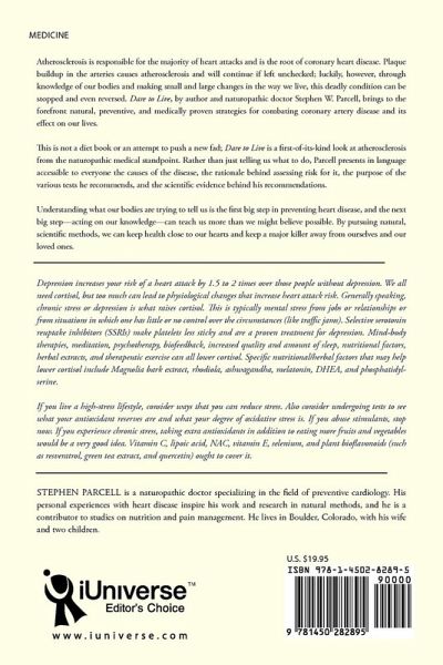 Atherosclerosis is responsible for the majority of heart attacks and is the root of coronary heart disease. Plaque buildup in the arteries causes atherosclerosis; luckily, however, through knowledge of our bodies and making small and large changes in the way we live, this deadly condition can be stopped and even reversed. Dare to Live, by author and naturopathic doctor Stephen W. Parcell, brings to the forefront natural, preventive, and medically proven strategies for combating coronary artery disease and its effect on our lives. This is not a diet book or an attempt to push a new fad; Dare to Live is a first-of-its-kind look at atherosclerosis from the naturopathic medical standpoint. Rather than just telling us what to do, Parcell presents in language accessible to everyone the causes of the disease, the rationale behind assessing risk for it, the purpose of the various tests he recommends, and the scientific evidence behind his recommendations. Understanding what our bodies are trying to tell us is the first big step in preventing heart disease, and the next big step-acting on our knowledge-can teach us more than we might believe possible. By pursuing natural, scientific methods, we can keep health close to our hearts and keep a major killer away from ourselves and our loved ones.