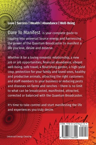 Love Success Wealth Abundance Well-Being Dare To Manifest is your complete guide on tapping into universal Source energy and harnessing the power of the Quantum Broadcaster to manifest a life you love, desire and deserve. Whether it be a loving romantic relationship, a new job or job opportunities, financial abundance, vibrant well-being, safe travel, a flourishing garden, a high-yield crop, protection for your family and loved ones, healthy and productive animals, attracting the right customers and staff members to your business or reducing pests and diseases on farms and ranches - there is no limit to what can be broadcasted, manifested, attracted, corrected or balanced with the Quantum Broadcaster. It's time to take control and start manifesting the life and experiences you truly desire.