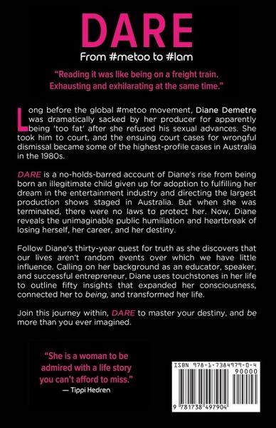 Long before the global #metoo movement, Diane Demetre was dramatically sacked by her producer for apparently being 'too fat' after she refused his sexual advances. She took him to court, and the ensuing court cases for wrongful dismissal became some of the highest-profile cases in Australia in the 1980s. Dare is a no-holds-barred account of Diane's rise from being born an illegitimate child given up for adoption to fulfilling her dream in the entertainment industry and directing the largest production shows staged in Australia. But when she was terminated, there were no laws to protect her. Now, Diane reveals the unimaginable public humiliation and heartbreak of losing herself, her career, and her destiny. Follow Diane's thirty-year quest for truth as she discovers that our lives aren't random events over which we have little influence. Calling on her background as an educator, speaker, and successful entrepreneur, Diane uses touchstones in her life to outline fifty insights that expanded her consciousness, connected her to being, and transformed her life. Join this journey within, Dare to master your destiny, and be more than you ever imagined.