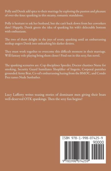 Polly and Derek add spice to their marriage by exploring the passion and pleasure of over-the-knee spanking in this steamy, romantic standalone. Polly is hesitant to ask her husband, but she can't back down from her coworkers dare! Happily, Derek greets the idea of spanking his wife's delectable bottom with enthusiasm. The two of them delight in the joys of erotic spanking until an embarrassing mishap angers Derek into unleashing his darker desires. They must work together to overcome this difficult moment in their marriage. Will fantasy role-playing bring them closer? Find out in this sexy, fun novel. The spanking scenarios are: Cop disciplines Speeder, Doctor chastises Nurse for smoking, Security Guard humiliates Shoplifter of lingerie, Corporal punishes grounded Army Brat, Co-ed's embarrassing hazing from the BMOC, and Condo Prez tames Nude Sunbather.