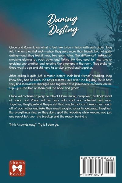 Chloe and Ronan know what it feels like to be in limbo with each other. They felt it when they first met-when they were more than friends but not quite dating-and they feel it now, two years later. The difference? Instead of sneaking glances at each other and flirting like they used to, now they're avoiding one another and ignoring the elephant in the room. They broke up three weeks ago and still have to survive a weekend together. After calling it quits just a month before their best friends' wedding, they knew they had to keep the news a secret until after the big day. This is how they find themselves sharing a bed together at a joint bachelor/bachelorette trip-just the two of them and the bride and groom. Chloe will continue to play the role of Claire's funny, outspoken, and bold maid of honor, and Ronan will be Jay's calm, cool, and collected best man. Together, they'll pretend they're still that couple that can't keep their hands off of each other and fake their way through a romantic getaway. They'll act like everything's fine so they don't spoil the wedding, while keeping not just one secret but two-the breakup and the reason behind it. Think it sounds easy? Try it. I dare ya.