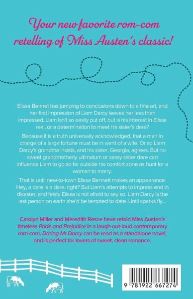 Your new favorite rom-com retelling of Miss Austen's classic! Elissa Bennet has jumping to conclusions down to a fine art, and her first impression of Liam Darcy leaves her less than impressed. Liam isn't so easily put off, but is his interest in Elissa real, or a determination to meet his sister's dare? Because it is a truth universally acknowledged, that a man in charge of a large fortune must be in want of a wife. Or so Liam Darcy's grandma insists, and his sister, Georgia, agrees. But no sweet grandmotherly ultimatum or sassy sister dare can influence Liam to go so far outside his comfort zone as hunt for a woman to marry. That is until new-to-town Elissa Bennett makes an appearance. Hey, a dare is a dare, right? But Liam's attempts to impress end in disaster, and feisty Elissa is not afraid to say so. Liam Darcy is the last person on earth she'd be tempted to date. Until sparks fly... Carolyn Miller and Meredith Resce have retold Miss Austen's timeless Pride and Prejudice in a laugh-out-loud contemporary rom-com. Daring Mr Darcy can be read as a standalone novel, and is perfect for lovers of sweet, clean romance.