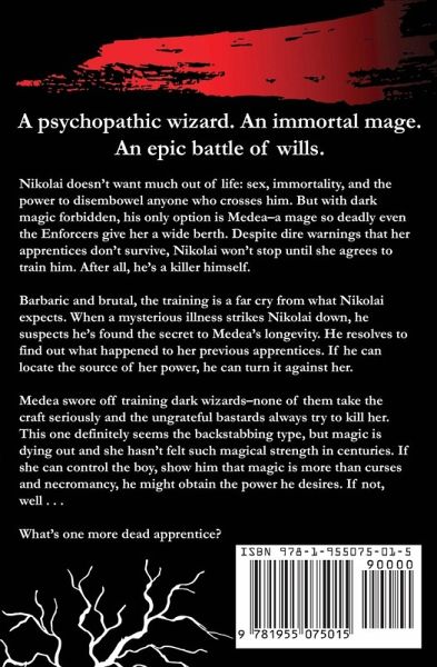 A psychopathic wizard. An immortal mage. An epic battle of wills. Nikolai doesn't want much out of life: sex, immortality, and the power to disembowel anyone who crosses him. But with dark magic forbidden, his only option is Medea-a mage so deadly even the Enforcers give her a wide berth. Despite dire warnings that her apprentices don't survive, Nikolai won't stop until she agrees to train him. After all, he's a killer himself. Barbaric and brutal, the training is a far cry from what Nikolai expects. When a mysterious illness strikes Nikolai down, he suspects he's found the secret to Medea's longevity. He resolves to find out what happened to her previous apprentices. If he can locate the source of her power, he can turn it against her. Medea swore off training dark wizards-none of them take the craft seriously and the ungrateful bastards always try to kill her. This one definitely seems the backstabbing type, but magic is dying out and she hasn't felt such magical strength in centuries. If she can control the boy, show him that magic is more than curses and necromancy, he might obtain the power he desires. If not, well . . . What's one more dead apprentice? If you enjoy dark fantasy with quirky, morally grey characters and humorous banter (but NO ROMANCE), this is the book for you!