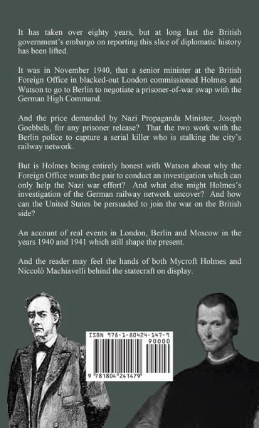 It has taken over eighty years, but at long last the British government's embargo on reporting this slice of diplomatic history has been lifted. It was in November 1940, that a senior minister at the British Foreign Office in blacked-out London commissioned Holmes and Watson to go to Berlin negotiate a prisoner of war swap with the German high-command. And the price demanded by Nazi Propaganda Minister, Joseph Göbbels, for any prisoner release? That the two work with the Berlin police to capture a serial killer who is stalking the city's railway network. But is Holmes being entirely honest with Watson about why the Foreign Office wants the pair to conduct an investigation which can only help the Nozi war-effort? And what else might Holmes's investigation of the German railway network uncover? And how can the United States be persuaded to join the war on the British side? An account of real events in London, Berlin, and Moscow in the years 1940 and 1941 which still shape the present. And the reader may feel hand of both Mycroft Holmes and Nicolo Machiavelli behind the statecraft on display.