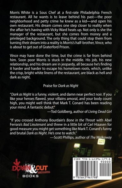 Morris White escaped the crime and working-class roots in the Philly projects by learning to cook. He's got great taste and impeccable kitchen skills, and now he's a Sous Chef at a first-rate Philadelphia French bistro. The stove burners aren't the only thing that's on fire in Morris's life, since his affair with Vicky Ward has just heated up. She's the manager at the bistro and comes from money and a privileged background. Together, they're dreaming of opening their own restaurant, where she'll run the front-of-the-house business and he'll run the kitchen. But their dream gets sidetracked when Morris takes in his half-brother, Vince Kammer, who's just been released from prison. Vince did time for a jewelry store robbery that went sideways, and the local mob boss who bankrolled the crime, Johnny "Stacks" Staccardo, is insisting that Vince pull another job to make up for the loss of the jewels he never received. Johnny Stacks has his gangster wannabe henchmen, Lenny and Mo, riding Vince pretty hard, and to make matters worse, Dick Franks, the corrupt cop who originally investigated the jewelry store heist, has gotten wind that Vince is out of the can. Franks believes Vince has the missing diamonds, and there's not much that Franks won't do to get his hands on those stones. When Morris discovers Vince's predicament, he has to summon the inner tough guy from his youth (and dig up a gun he had hidden away), to keep Vince from doing anything stupid. Caught between the gangsters, the vicious Dick Franks, and Vince's own desire for revenge, Morris risks losing his new love, his dreams, even his life in order to save Vince from himself. Praise for DARK AS NIGHT: "Dark as Night is a funny, violent, and damn near perfect noir. If you like your heroes flawed, your villains amoral, and your body count high, you might well think that Mark T. Conard has been reading your mind. A fantastic debut." -Tod Goldberg, author of Living Dead Girl "If you crossed Anthony Bourdain's Bone in the Throat with Abel Ferrara's Bad Lieutenant and threw in a little bit of Carl Hiaasen for good measure you might get something like Mark T. Conard's funny and brutal Dark as Night. He's one to watch." -Scott Phillips, author of The Walkaway