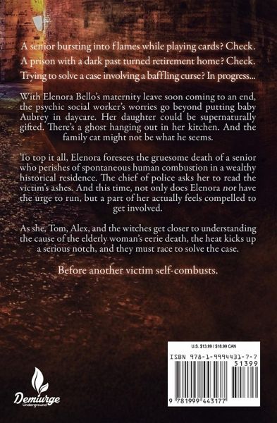 An elderly woman bursting into flames while playing bridge? Check. A former prison with a dark past turned senior home? Check. Trying to solve a baffling case involving an ancient curse? In progress... With Elenora Bello's maternity leave soon coming to an end, the psychic social worker's worries go beyond putting baby Aubrey in daycare. Her daughter could be supernaturally gifted. There's a ghost hanging out in her kitchen. And the family cat might not be what he seems. To top it all, Elenora foresees the gruesome death of a senior who perishes of spontaneous human combustion in a wealthy historical residence. The chief of police asks her to read the victim's ashes. And this time, not only does Elenora not have the urge to run, but a part of her actually feels compelled to get involved. As she, Tom, Alex, and the witches get closer to understanding the cause of the elderly woman's eerie death, the heat kicks up a serious notch, and they must race to solve the case. Before another victim self-combusts. Dark Ashes contains a formerly reluctant psychic finally starting to own her surprising abilities, as well as sassy witches, touching moments and creepy bits, twists, and a found family that includes members from beyond the veil.