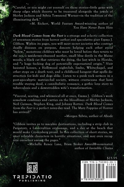 Dark Blood Comes from the Feet is a strange and eclectic collection of seventeen stories from horror author and speculative poet, Emma J. Gibbon. Within its pages, you will meet secret societies who contract deadly diseases on purpose, dancers helping each other avoid "below," monstrous children who must be loved before they return to the sea, a taxidermy-obsessed mother, small blue devils in the Maine woods, a black cat that retrieves the dying, the last witch in Florida, and "a huge fucking dog of potentially supernatural origin." Visit haunted houses, a Hollywood nightclub, limbo, Whitechapel, and other stops on a death tour, and a childhood hangout that spells destruction for kids and dogs alike. Listen to a punk rock sermon in a post-apocalyptic matriarchal society, witness crustaceans that have trouble staying dead, a cannibalistic romance, a gothic love story to tuberculosis and a downtrodden wife's transformation.