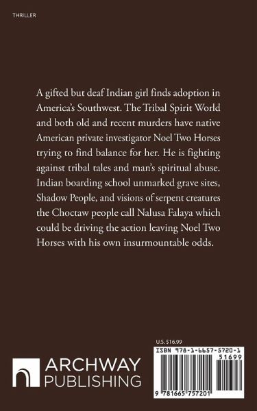 A gifted but deaf Indian girl finds adoption in America's Southwest. The Tribal Spirit World and both old and recent murders have native American private investigator Noel Two Horses trying to find balance for her. He is fighting against tribal tales and man's spiritual abuse. Indian boarding school unmarked grave sites, Shadow People, and visions of serpent creatures the Choctaw people call Nalusa Falaya which could be driving the action leaving Noel Two Horses with his own insurmountable odds.