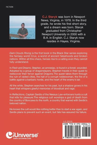 Dark Clouds Rising is the first book in the Black Star series exploring the fantasy world Crux, a world of ancient falsehoods and broken nations. Within all this chaos, heroes rise to a calling even they cannot fully understand. In Flesh and Dreams, Stephen, an amnesiac, is found in a forest, wounded. Adopted by a group of dragonslayers, Stephen travels in their quest to rediscover their fervor against Dragons.The quest takes them through the ruin of raided cities, the hall of a corrupt noblewoman, the fire of a battle against a barbaric horde, and the heart of the enemy's lair. All the while, Stephen searches for his past, but a shadow grows in his heart that whispers gleeful memories of bloodlust and rage. In Reflections, Captain Serdis of the Nessus Law-enforcers hunts a cult that kills for pleasure.The religious cult worships a god of death from the country of Boncawa to the north, a country that warred with Serdis's beloved nation. He knows the cult would like nothing better than to start a war again, and Serdis plans to prevent such an event, but fate has assured his failure.