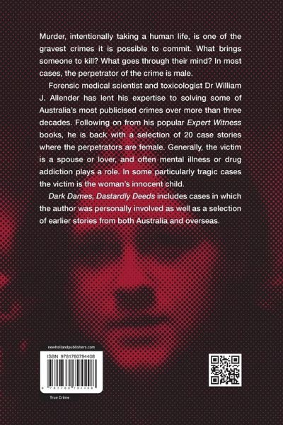 Murder, intentionally taking a human life, is one of the gravest crimes it is possible to commit. What brings someone to kill? What goes through their mind? In most cases, the perpetrator of the crime is male. Forensic medical scientist and toxicologist Dr William J. Allender has lent his expertise to solving some of Australia's most publicised crimes over more than three decades. Following on from his popular Expert Witness books, he is back with a selection of 20 case stories where the perpetrators are female. Generally, the victim is a spouse or lover, and often mental illness or drug addiction plays a role. In some particularly tragic cases the victim is the woman's innocent child. "Dark Dames, Dastardly Deeds" includes cases in which the author was personally involved as well as a selection of earlier stories from both Australia and overseas.