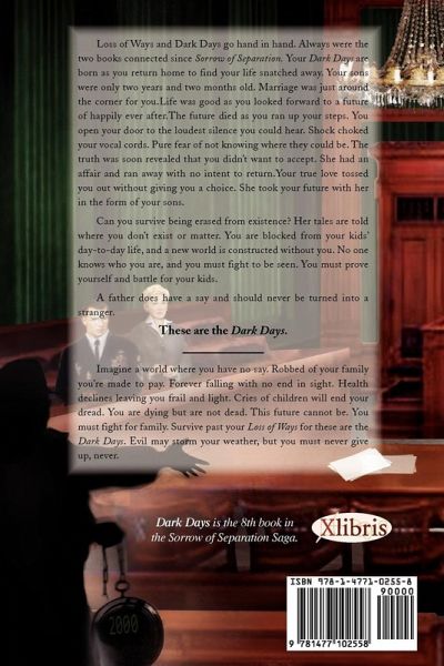 Loss of Ways and Dark Days go hand in hand. Always were the two books connected since Sorrow of Separation. Your Dark Days are born as you return home to find your life snatched away. Your sons were only two years and two months old. Marriage was just around the corner for you. Life was good as you looked forward to a future of happily ever after. The future died as you ran up your steps. You open your door to the loudest silence you could hear. Shock choked your vocal cords. Pure fear of not knowing where they could be. The truth was soon revealed that you didn't want to accept. She had an affair and ran away with no intent to return. Your true love tossed you out without giving you a choice. She took your future with her in the form of your sons. Can you survive being erased from existence? Her tales are told where you don't exist or matter. You are blocked from your kids' day-to-day life, and a new world is constructed without you. No one knows who you are, and you must fight to be seen. You must prove yourself and battle for your kids. A father does have a say and should never be turned into a stranger. These are the Dark Days __________________ Imagine a world where you have no say. Robbed of your family you're made to pay. Forever falling with no end in sight. Health declines leaving you frail and light. Cries of children will end your dread. You are dying but are not dead. This future cannot be. You must fight for family. Survive past your Loss of Ways for these are the Dark Days. Evil may storm your weather, but you must never give up, never. Dark Days is the 8th book in the Sorrow of Separation Saga.