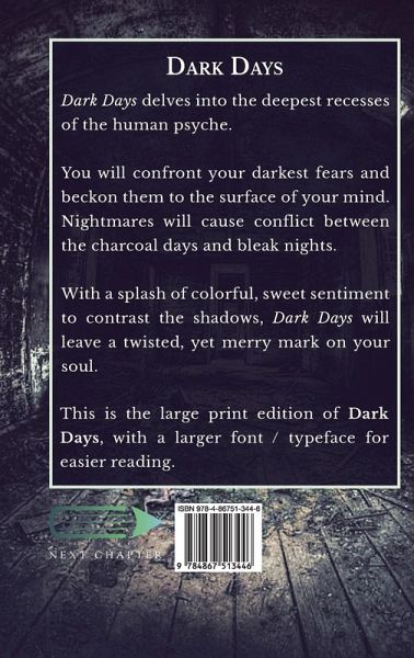 Dark Days delves into the deepest recesses of the human psyche. You will confront your darkest fears and beckon them to the surface of your mind. Nightmares will cause conflict between the charcoal days and bleak nights. With a splash of colorful, sweet sentiment to contrast the shadows, Dark Days will leave a twisted, yet merry mark on your soul. This is the large print edition of Dark Days, with a larger font / typeface for easier reading.