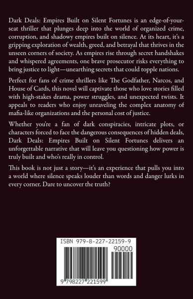 Dark Deals: Empires Built on Silent Fortunes is an edge-of-your-seat thriller that plunges deep into the world of organized crime, corruption, and shadowy empires built on silence. At its heart, it's a gripping exploration of wealth, greed, and betrayal that thrives in the unseen corners of society. As empires rise through secret handshakes and whispered agreements, one brave prosecutor risks everything to bring justice to light-unearthing secrets that could topple nations. Perfect for fans of crime thrillers like The Godfather, Narcos, and House of Cards, this novel will captivate those who love stories filled with high-stakes drama, power struggles, and unexpected twists. It appeals to readers who enjoy unraveling the complex anatomy of mafia-like organizations and the personal cost of justice. Whether you're a fan of dark conspiracies, intricate plots, or characters forced to face the dangerous consequences of hidden deals, Dark Deals: Empires Built on Silent Fortunes delivers an unforgettable narrative that will leave you questioning how power is truly built and who's really in control. This book is not just a story-it's an experience that pulls you into a world where silence speaks louder than words and danger lurks in every corner. Dare to uncover the truth?