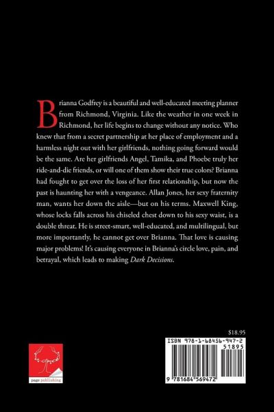 Brianna Godfrey is a beautiful and well-educated meeting planner from Richmond, Virginia. Like the weather in one week in Richmond, her life begins to change without any notice. Who knew that from a secret partnership at her place of employment and a harmless night out with her girlfriends, nothing going forward would be the same. Are her girlfriends Angel, Tamika, and Phoebe truly her ride-and-die friends, or will one of them show their true colors? Brianna had fought to get over the loss of her first relationship, but now the past is haunting her with a vengeance. Allan Jones, her sexy fraternity man, wants her down the aisle-but on his terms. Maxwell King, whose locks falls across his chiseled chest down to his sexy waist, is a double threat. He is street-smart, well-educated, and multilingual, but more importantly, he cannot get over Brianna. That love is causing major problems! It's causing everyone in Brianna's circle love, pain, and betrayal, which leads to making Dark Decisions.