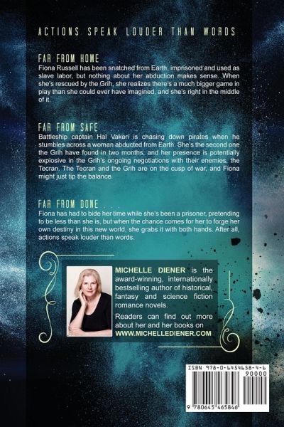 Rescue might just be the death of her. Far from home . . . Fiona Russell has been snatched from Earth, imprisoned and used as slave labor, but nothing about her abduction makes sense. When she's rescued by the Grih, she realizes there's a much bigger game in play than she could ever have imagined, and she's right in the middle of it. Far from safe . . . Battleship captain Hal Vakeri is chasing down pirates when he stumbles across a woman abducted from Earth. She's the second one the Grih have found in two months, and her presence is potentially explosive in the Grih's ongoing negotiations with their enemies, the Tecran. The Tecran and the Grih are on the cusp of war, and Fiona might just tip the balance. Far from done . . . Fiona has had to bide her time while she's been a prisoner, pretending to be less than she is, but when the chance comes for her to forge her own destiny in the new world she's found herself in, she grabs it with both hands. After all, actions speak louder than words.