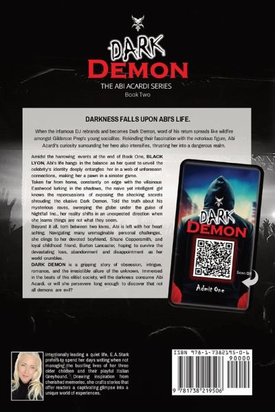 THE ABI ACARDI SERIES: Book 2 DARKNESS FALLS UPON ABI'S LIFE. When the infamous DJ rebrands and becomes Dark Demon, word of his return spreads like wildfire amongst Gilderson Prep's affluent young socialites, rekindling their fascination with the notorious figure. Abi Acardi's curiosity surrounding her hero also intensifies, thrusting her into a dangerous realm. Amidst the harrowing events at the end of Book One, BLACK LYON, Abi's life hangs in the balance as her quest to unveil the celebrity's identity deeply entangles her in a web of unforeseen connections, making her a pawn in a sinister game. Taken far from home, constantly on edge with the villainous Eastwood lurking in the shadows, the naïve yet intelligent girl knows the repercussions of exposing the shocking secrets shrouding the elusive Dark Demon. Told the truth about his mysterious raves, sweeping the globe under the guise of Nightfall Inc., her reality shifts in an unexpected direction when she learns things are not what they seem. Beyond it all, torn between two loves, Abi is left with her heart aching. Navigating many unimaginable personal challenges, she clings to her devoted boyfriend, Shane Coppersmith, and her loyal childhood friend, Burton Lancaster, hoping to survive the devastating loss, abandonment, and disappointment as her world crumbles. DARK DEMON is a gripping story of obsession, intrigue, romance, and the irresistible allure of the unknown. Immersed in the beats of this elitist society, will the darkness consume Abi Acardi, or will she persevere long enough to discover that not all demons are evil?