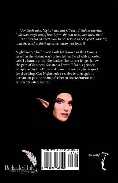 "For God's sake, Nightshade. Just kill them." Galvin snarled. "We have to get out of here before the sun rises, you know that." The order was a deathblow to her resolve to be a good Dark Elf, and she tried to think up some reason not to do it. Nightshade, a half-breed Dark Elf, known as the Drow, is raised in the violent ways of her father. Faced with an order to kill a human child, she realizes she can no longer follow the path of darkness. Sunstar, a Forest Elf and a princess, is captured by the Drow and taken to their city to be sport for their king. Can Nightshade's resolve to turn against her violent past be enough for her to rescue Sunstar and return her safely home?