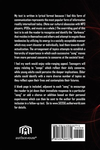 Since its conception mankind has sought answers to questions that would enable us to define who we are and our role in the grand scheme of "things". Of the numerous questions posed, I feel that those concerned with human behavior are perhaps the most important. What governs our behavior? Why do "good"people do "bad" things? What lies ahead ? I address these questions and many more in my text using a novel, fresh approach, a lyrical format. Using this format, I provide examples ("songs") which illuminates the "darkside" of human behavior. The goal of my work is to ask the reader to recognize and identify the "darkness" that resides within themselves and others and utilize this "dark energy" in a socially acceptable manner to avert disaster, or individually, lead themselves towards self-actualization. This text will have wide-ranging appeal. Teenagers will enjoy relating to "songs" reflecting their daily concerns, while young adults could perceive the deeper implications. Older adults could identify with a more diverse number of topics as they reflect upon their lives and contemplate their futures. Additionally, it may yield special appeal to musicians and composers of all ages, as well as all those with a interest in Comparative Studies, Literature, and/or the Humanities. A blank page is included, adjacent to each "song" to encourage the reader to jot down their immediate response to a particular "song" or add a chorus or addition based on their personal experiences which may be sent to the author for possible inclusion in a follow-up text. (go to www.50356.authorworld.com for details)