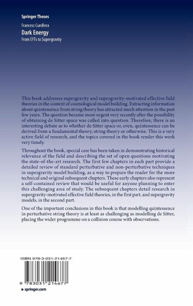 This book addresses supergravity and supergravity-motivated effective field theories in the context of cosmological model building. Extracting information about quintessence from string theory has attracted much attention in the past few years. The question became more urgent very recently after the possibility of obtaining de Sitter space was called into question. Therefore, there is an interesting debate as to whether de Sitter space or, even, quintessence can be derived from a fundamental theory, string theory or otherwise. This is a very active field of research, and the topics covered in the book render this work very timely.