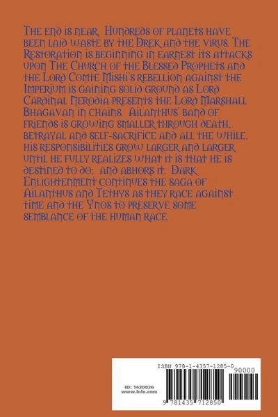 The end is near. Hundreds of planets have been laid waste by the Drek and the virus. The Restoration begins in earnest its campaign to destroy The Church of the Blessed Prophets. Lord Comte Mishi's rebellion against what's left of the Imperium gains solid ground as the Lord Cardinal Nerodia presents the Lord Marshall Bhagavan in chains. Ailanthus' band of friends grows smaller and smaller with death, betrayal and self-sacrifice, while his responsibilities grow larger and larger and he learns fully the distorted history of humans and Dwad-Mehstiv and what he must do to save the last remnant of humanity. Thus continues the saga of Ailanthus and Tethys, two friends caught up in a universe that wants more from them than they are willing to give.