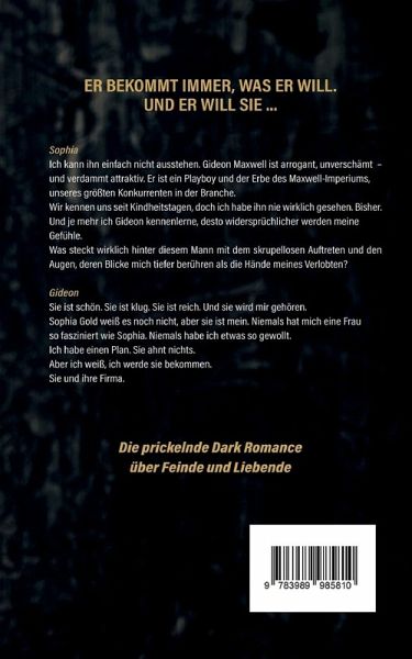 Er bekommt immer, was er will. Und er will sie … Die prickelnde Dark Romance über Feinde und Liebende Sophia Ich kann ihn einfach nicht ausstehen. Gideon Maxwell ist arrogant, unverschämt – und verdammt attraktiv. Er ist ein Playboy und der Erbe des Maxwell-Imperiums, unseres größten Konkurrenten in der Branche. Wir kennen uns seit Kindheitstagen, doch ich habe ihn nie wirklich gesehen. Bisher. Und je mehr ich Gideon kennenlerne, desto widersprüchlicher werden meine Gefühle. Was steckt wirklich hinter diesem Mann mit dem skrupellosen Auftreten und den Augen, deren Blicke mich tiefer berühren als die Hände meines Verlobten? Gideon Sie ist schön. Sie ist klug. Sie ist reich. Und sie wird mir gehören. Sophia Gold weiß es noch nicht, aber sie ist mein. Niemals hat mich eine Frau so fasziniert wie Sophia. Niemals habe ich etwas so gewollt. Ich habe einen Plan. Sie ahnt nichts. Aber ich weiß, ich werde sie bekommen. Sie und ihre Firma. Erste Leser:innenstimmen „Die prickelnde Dynamik zwischen Sophia und Gideon ist einfach elektrisierend!" „Die Mischung aus Romantik, Intrigen und geschäftlichen Rivalitäten macht diesen Liebesroman unglaublich spannend." „Sophia und Gideon sind ein unvergessliches Paar, deren Beziehung voller Leidenschaft und Konflikte ist." „Die feine Balance zwischen leidenschaftlicher Romantik und mitreißendem Drama hat mich restlos überzeugt."