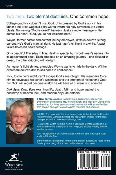 Two men. Two eternal destinies. One common hope. College grad Nick doesn’t trust God. Unimpressed by God’s work in his father’s life, Nick wages a daily war to thwart His holy advances. No verbal blasts. No waving "God is dead!" banners. Just a simple message written across his heart: "God, you’re not welcome here." Wayne, former pastor and current factory employee, drifts in doubt’s strong current. He’s God’s man, all right. He just hasn’t felt like it in a while. A past failure holds his heart hostage. On a beautiful Thursday in May, death’s specter burns both men’s names into its appointment book. Each embarks on an amazing journey—one doused in dread, the other dripping with delight. As heaven’s light shines, a troubled Wayne wants to hide in the dark. Will he overcome doubt’s drift to sail home in confidence? Nick, lost in hell’s night, can’t escape God’s searchlight. His memories force him to reevaluate his father’s weakness and the strength of his father’s God. For Nick, will regret become an itch he will have all eternity to scratch? Dark Eyes, Deep Eyes examines life, death, faith, and hope against the backdrop of heaven, hell, and modern-day San Antonio.