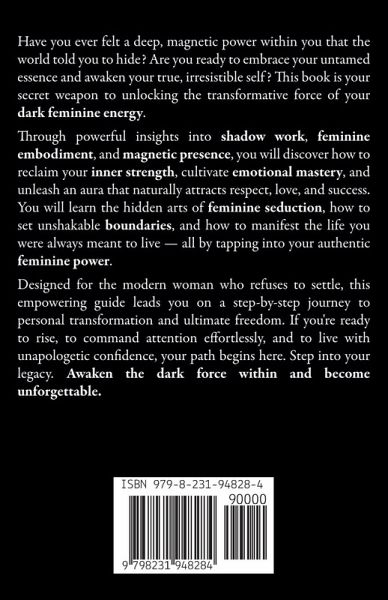 Have you ever felt a deep, magnetic power within you that the world told you to hide? Are you ready to embrace your untamed essence and awaken your true, irresistible self? This book is your secret weapon to unlocking the transformative force of your dark feminine energy. Through powerful insights into shadow work, feminine embodiment, and magnetic presence, you will discover how to reclaim your inner strength, cultivate emotional mastery, and unleash an aura that naturally attracts respect, love, and success. You will learn the hidden arts of feminine seduction, how to set unshakable boundaries, and how to manifest the life you were always meant to live - all by tapping into your authentic feminine power. Designed for the modern woman who refuses to settle, this empowering guide leads you on a step-by-step journey to personal transformation and ultimate freedom. If you're ready to rise, to command attention effortlessly, and to live with unapologetic confidence, your path begins here. Step into your legacy. Awaken the dark force within and become unforgettable.