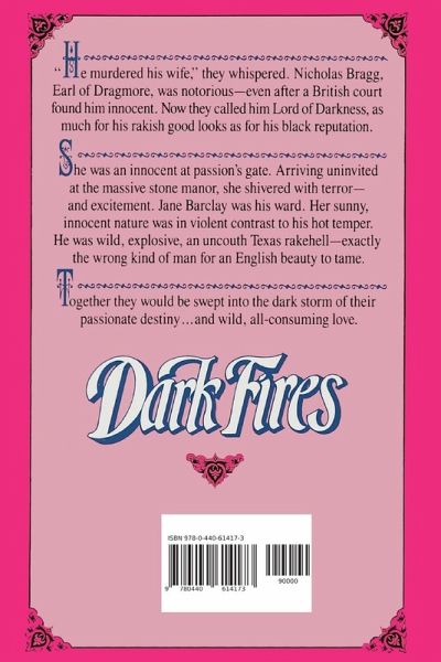 "He murdered his wife," they whispered. Nicholas Bragg, Earl of Dragmore, was notorious--even after a British court found him innocent. Now they called him Lord of Darkness, as much for his rakish good looks as for his black reputation. She was an innocent at passion's gate. Arriving uninvited at the massive stone manor, she shivered with terror--and excitement. Jane Barclay was his ward. Her sunny, innocent nature was in violent contrast to his hot temper. He was wild, explosive, an uncouth Texas rakehell--exactly the wrong kind of man for an English beauty to tame. Together they would be swept into the dark storm of their passionate destiny...and wild, all-consuming love.