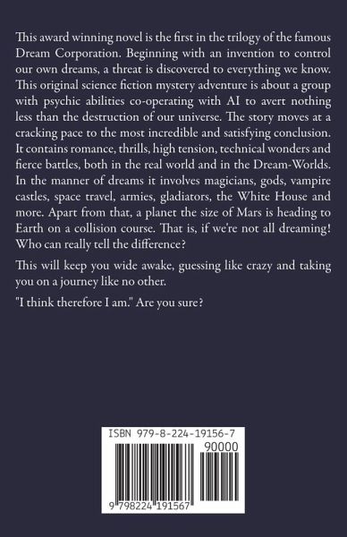 This award winning novel is the first in the trilogy of the famous Dream Corporation. Beginning with an invention to control our own dreams, a threat is discovered to everything we know. This original science fiction mystery adventure is about a group with psychic abilities co-operating with AI to avert nothing less than the destruction of our universe. The story moves at dramatic pace to the most incredible dramatic conclusion and includes romance, thrills, high tension, technical wonders and fierce battles, both in the real world and in the Dream-Worlds. In the manner of dreams it involves magicians, gods, vampires, space travel, armies, gladiators, the White House and more. Apart from that, a planet the size of Mars is heading to Earth on a collision course. That is, if we're not all dreaming! Who can really tell the difference? This will keep you guessing and take you in a journey like no other. It will teach you more about dreams than you thought possible and have you questionnig the nature of reality itself. "I think therefore I am." Are you sure?