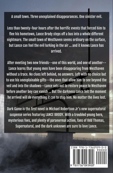 A small town. Three unexplained disappearances. One sinister evil. Less than twenty-four hours after the horrific events that forced him to flee his hometown, Lance Brody steps off a bus into a whole different nightmare. The small town of Westhaven seems ordinary on the surface, but Lance can feel the evil lurking in the air ... and it knows Lance has arrived. After meeting two new friends--one of this world, and one of another--Lance learns that young men have been disappearing from Westhaven without a trace. No clues left behind, no answers. Left with no choice but to use his unexplainable gifts--the ones that allow him to see beyond the veil and into the shadows--Lance sets out to restore peace to Westhaven before another boy can vanish ... But the darkness Lance felt the moment he arrived will do everything it can to stop him. No matter the lives lost. Dark Game is the first novel in Michael Robertson Jr's supernatural suspense series featuring LANCE BRODY. With a troubled young hero, mysterious foes, and plenty of paranormal action, fans of Odd Thomas, Supernatural, and the dark unknown are sure to love Lance. Pick up Dark Game and join Lance Brody in his latest mystery today!
