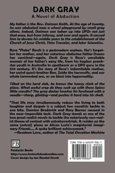 My father is the Rev. Daimon Keith. At the age of twenty, he was abducted near a school playground by small gray aliens. Indeed, Daimon was taken up into UFOs not just that once, but from infancy, and over and again. It caused him to devote his middle years to the establishment of the Church of Jesus Christ, Time Traveler, and later Scionetics. Rosa "Flake" Rosch is a postmodern orphan. She's forgotten her mother, and her notorious abductee father Deems has vanished?again. Dark Gray is Rosa's unreliable memoir of her father's zany life, from his hapless prankster youth in Australia to apotheosis as a UFO guru in the 21st century. It's the story of Rosa's indomitable mother, her weird quasi-brother Ben, Zelda the horsewife, and our whole tormented era, as we blast into hyperreality. Tilted on the hard slab, he knows the heavy stink of the place. What awful crap do they suck up with those lipless little mouths? The gray doctor touches his forehead with a needle?sharp, glinting?and pushes it hard into his skull. "That life may simultaneously reduce the living to both laughter and despair is a subject few novelists tackle in one bite. Damien Broderick and Rory Barnes succeed in the near-impossible task. Dark Gray stands as one of the two great realist novels to tackle the notoriously non-realist theme of contact with extraterrestrials. It resides on the same (astral) plane as Alison Lurie's magisterial Imaginary Friends.... A quite brilliant achievement." ?Rosaleen Love, author of The Total Devotion Machine Finalist for the Aurealis Award and the Ditmar Award.