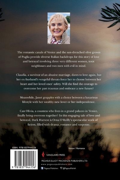 The romantic canals of Venice and the sun-drenched olive groves of Puglia provide diverse ¿Italian backdrops for this story of love and betrayal involving three very different women, ¿toxic neighbours and two men with evil in mind. ¿ Claudia, a survivor of an abusive marriage, dares to love again, but her ex-husband's vengeful ¿threats force her to choose between her heart and her loved ones' safety. Will she find the ¿courage to overcome her past traumas and embrace a new future?¿ Meanwhile, Janet grapples with a choice between a luxurious lifestyle with her wealthy new ¿lover or her independence. ¿ Can Olivia, a countess who lives in a grand palazzo in Venice, finally bring everyone ¿together? In this engaging tale of love and betrayal, Dark Harvest is Orna O'Reilly's spectacular ¿work of fiction, filled with drama, romance and suspense. ¿