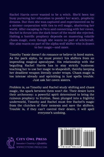 Rachel Harris never wanted to be a witch. She'd been too busy pursuing her education to ponder her scary, prophetic dreams. But then she was captured and experimented on by a sinister corporation with ties to evil magic, shattering her world. After escaping to Peru and connecting with her coven, Rachel is thrust into the dark heart of the world she rejected. Halting a horrific prophecy depends on mastering volatile chaos magic, even though she wants no part of witchcraft. She also wants no part of the alpha wolf shifter who is drawn to her magic-and more. Timothy Tsosie doesn't do romance or believe in fated mates. As the pack alpha, he must protect his shifters from an impending magical apocalypse. His relationship with the beguiling Rachel Harris has to stay strictly business: teaching her to use her magic to shapeshift, thereby keeping her deadliest weapon literally under wraps. Chaos magic is too intense already and sprinkling in lust spells trouble. Just ask her coven sisters. Problem is, as Timothy and Rachel study shifting and chaos magic, the spark between them won't die. Their desire lures their archenemy: a powerful spirit determined to bring the ruinous prophecy to fruition. Soon plunged into a frightful underworld, Timothy and Rachel must free Rachel's magic from the clutches of their nemesis and save the shifters. Trouble is, if they can't control their desire, it will spell everyone's undoing.