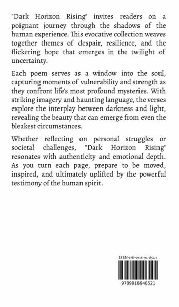 "Dark Horizon Rising" invites readers on a poignant journey through the shadows of the human experience. This evocative collection weaves together themes of despair, resilience, and the flickering hope that emerges in the twilight of uncertainty. Each poem serves as a window into the soul, capturing moments of vulnerability and strength as they confront life's most profound mysteries. With striking imagery and haunting language, the verses explore the interplay between darkness and light, revealing the beauty that can emerge from even the bleakest circumstances. Whether reflecting on personal struggles or societal challenges, "Dark Horizon Rising" resonates with authenticity and emotional depth. As you turn each page, prepare to be moved, inspired, and ultimately uplifted by the powerful testimony of the human spirit.