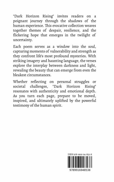 "Dark Horizon Rising" invites readers on a poignant journey through the shadows of the human experience. This evocative collection weaves together themes of despair, resilience, and the flickering hope that emerges in the twilight of uncertainty. Each poem serves as a window into the soul, capturing moments of vulnerability and strength as they confront life's most profound mysteries. With striking imagery and haunting language, the verses explore the interplay between darkness and light, revealing the beauty that can emerge from even the bleakest circumstances. Whether reflecting on personal struggles or societal challenges, "Dark Horizon Rising" resonates with authenticity and emotional depth. As you turn each page, prepare to be moved, inspired, and ultimately uplifted by the powerful testimony of the human spirit.