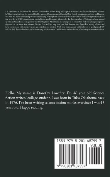 - It appears to be the end of the line and all seems lost. While being held captive by the evil and fanatical religious cult that he'd been running from for most of his life, temporal Security agent Captain Orin Garvik struggles to embrace and become one with his newly awakened powers while secretly battling both his internal spiritual weakness and his long held childhood fear in order to fulfill his destiny and regain his personal freedom. Meanwhile, the three members of Orin's team have teamed up with an Ouclahrian teenager and travel to the planet Alira Prime and attempt to to rescue him without telling the agency's director . At the same time, director Merissa Fran and her long time rival Jade Samone have formed an uneasy alliance and have commenced with their own self appointed rescue mission. With time running out, will the forces of good prevail? Or will the dark forces of evil succeed in destroying all of creation. You'll have to read to the end of the story in order to find out.