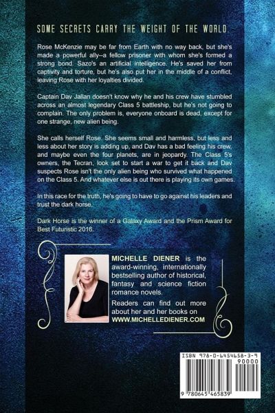 Some secrets carry the weight of the world. Rose McKenzie may be far from Earth with no way back, but she's made a powerful ally--a fellow prisoner with whom she's formed a strong bond. Sazo's an artificial intelligence. He's saved her from captivity and torture, but he's also put her in the middle of a conflict, leaving Rose with her loyalties divided. Captain Dav Jallan doesn't know why he and his crew have stumbled across an almost legendary Class 5 battleship, but he's not going to complain. The only problem is, everyone onboard is dead, except for one strange, new alien being. She calls herself Rose. She seems small and harmless, but less and less about her story is adding up, and Dav has a bad feeling his crew, and maybe even the four planets, are in jeopardy. The Class 5's owners, the Tecran, look set to start a war to get it back and Dav suspects Rose isn't the only alien being who survived what happened on the Class 5. And whatever else is out there is playing its own games. In this race for the truth, he's going to have to go against his leaders and trust the dark horse. Dark Horse is the winner of a Galaxy Award and the Prism Award for Best Futuristic 2016.