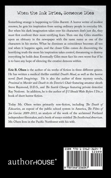 When the Ink Dries, Someone Dies Something strange is happening to Giles Barrett. A horror writer of modest renown, he gets his inspiration from seeing ordinary people in everyday life. But when his dark imagination takes over his characters dont just die, they must first confront their most terrifying fears. Then one day Giles stumbles upon an obituary in the newspaper with the same name as one of the characters in his stories. What he dismisses as coincidence becomes all too real when it happens again, and the closer Giles comes do discovering the horrifying truth the more his inspiration takes control, threatening to destroy everything he holds dear. Eventually Giles must face his own worst fear if he is to have any hope of silencing the creative demons within.