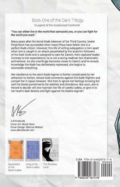 "you can either live in the world that surrounds you, or you can fight for the world you want." Many years after the brutal Kade takeover of the Third Country, healer Freya Kuch has succeeded when many Pious have failed: she is a perfect Kade citizen. However, this life of willing subjugation is torn apart when she is caught in an attack perpetrated by the anarchic followers of the Dark Gods and is assigned to care for Zarech, their captured leader. Contrary to her expectations, he is not a raving madman but charismatic and rational. As she unwillingly becomes closer to Zarech and he reveals knowledge the Kade has deliberately repressed, she begins to reconsider everything. Her obedience to the strict Kade regime is further complicated by her attraction to Ashtyn, whose bold comments against the Kade frighten and compel her in equal measure. She tries to ignore her feelings knowing full well the brutal punishments for adultery and dissidence. But soon, she is forced to decide: will she maintain her life of careful safety, or give in to her heart's dark desires and fight against the Kade's regime?