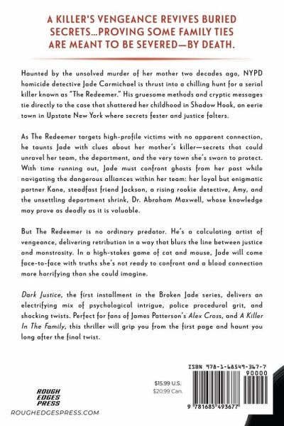 A KILLER'S VENGEANCE REVIVES BURIED SECRETS...PROVING SOME FAMILY TIES ARE MEANT TO BE SEVERED-BY DEATH. Haunted by the unsolved murder of her mother two decades ago, NYPD homicide detective Jade Carmichael is thrust into a chilling hunt for a serial killer known as "The Redeemer." His gruesome methods and cryptic messages tie directly to the case that shattered her childhood in Shadow Hook, an eerie town in Upstate New York where secrets fester and justice falters. As The Redeemer targets high-profile victims with no apparent connection, he taunts Jade with clues about her mother's killer-secrets that could unravel her team, the department, and the very town she's sworn to protect. With time running out, Jade must confront ghosts from her past while navigating the dangerous alliances within her team: her loyal but enigmatic partner Kane, steadfast friend Jackson, a rising rookie detective, Amy, and the unsettling department shrink, Dr. Abraham Maxwell, whose knowledge may prove as deadly as it is valuable. But The Redeemer is no ordinary predator. He's a calculating artist of vengeance, delivering retribution in a way that blurs the line between justice and monstrosity. In a high-stakes game of cat and mouse, Jade will come face-to-face with truths she's not ready to confront and a blood connection more horrifying than she could imagine. Dark Justice, the first installment in the Broken Jade series, delivers an electrifying mix of psychological intrigue, police procedural grit, and shocking twists. Perfect for fans of James Patterson's Alex Cross, and A Killer In The Family, this thriller will grip you from the first page and haunt you long after the final twist.