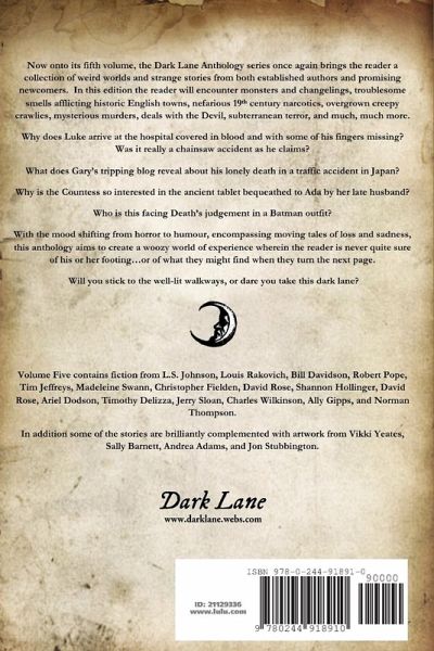 Now onto its fifth volume, the Dark Lane Anthology series once again brings the reader a collection of weird worlds and strange stories from both established authors and promising newcomers. In this edition the reader will encounter monsters and changelings, troublesome smells afflicting historic English towns, nefarious 19th century narcotics, overgrown creepy crawlies, mysterious murders, deals with the devil, subterranean terror, and much much more. Will you stick to the well-lit walkways, or dare you take this dark lane?